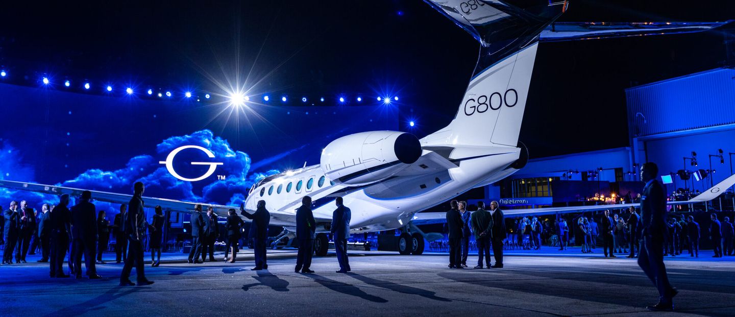 The second big reveal of the evening featured a CGI film teaser of the G800. With the film playing on the main screen, the physical plane was being brought into position behind the audience. As the video began to close, the physical aircraft was shown on the main screen revealing its position right behind the audience. The G800 was towed directly into the audience area and up to the stage for a dramatic nose to nose reveal unlike any other in the industry to date.